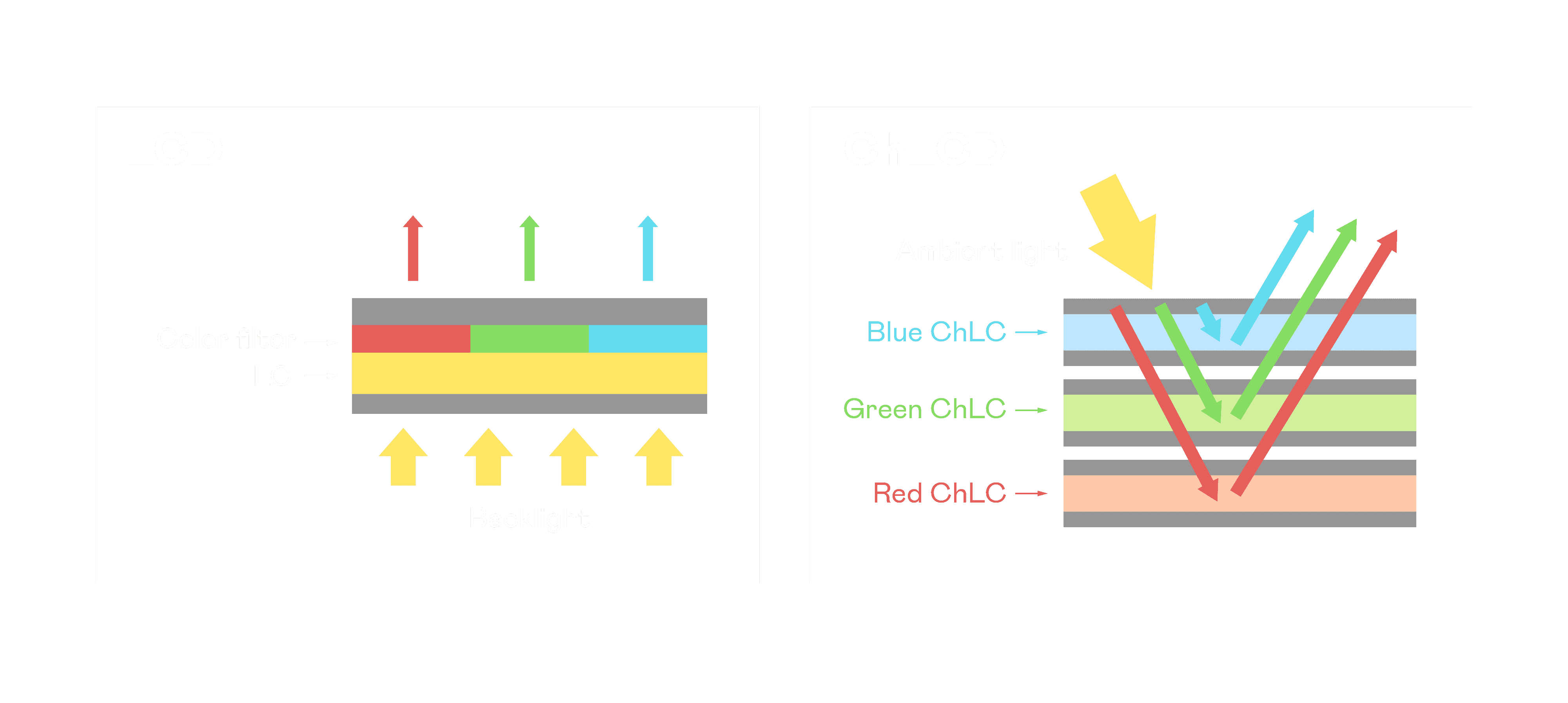 ChLCD 胆固醇液晶就如同纸张一样,,,,透过反射环境光来显示影像,,,因此长时间观看不易造成人眼视觉疲劳,,,可达到护眼效果。。。。当处于户外阳光下使用,,LCD 影像容易失真而不易观看,,,但胆固醇液晶仍可维持较佳的影像品质。。。